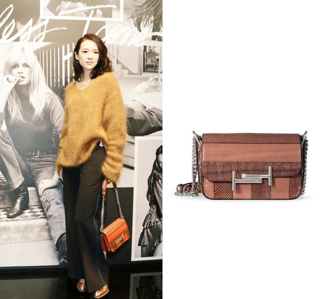 值得入手: 这只Double T是2017春夏的新款,拼接的蟒蛇皮是这款手袋的亮点,去年11月Tod's东京的活动上,章子怡就背过这款手袋。