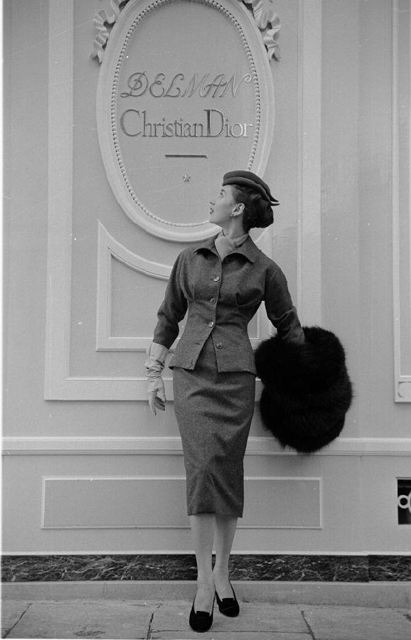 1953年,模特着Dior套装铅笔裙展现精致的女人味