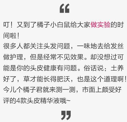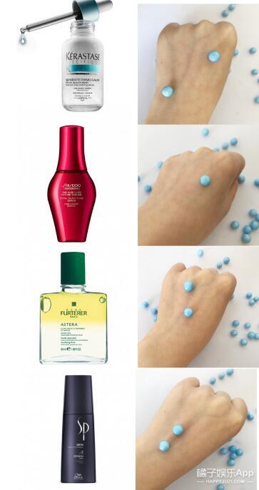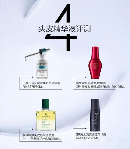 1. 外观和质地:观察瓶身,再取少量头皮精华液涂抹在手背上,观察质地。 1、巴黎卡诗头皮密集舒缓精华液 RMB375/50ml 产品官方介绍: 卓越舒缓成分,缓解头皮敏感不适症状。头皮悦享舒缓放松体验。 使用方法:每周3次,每次2滴管。 染烫前,使用头皮密集舒缓精华液,保护头皮在染烫服务时免受头皮敏感问题困扰。 银白色瓶身,瓶口为滴管设计。 质地为很轻薄的透明油状液体,流动性很好。 2、资生堂专业美发 护理道 凝时焕发头皮精华液 RMB420/125ml 产品官方介绍: 源自资生堂原创护肤科技,孕于发芯,精于发梢,多方位呵护头皮层细胞,多角度对抗发丝问题,多种护肤级调理成分精准修护,强韧美丽,始于基底。 使用方法:洗发后,充分拭干水分,或在干发情况下直接使用;将喷头直接贴到头皮喷涂若干部位,一边喷涂一边抹匀后,充分按摩头皮。 红色的透明瓶身,瓶口为喷头设计。 质地为透明无色液体,流动性很好~ 3、馥绿德雅头皮舒缓清润油--1号精油 RMB280/50ml 产品官方介绍: 富含留兰香叶精油、蓝桉叶精油和狭叶松果菊精华,有效深层清洁头皮,缓解头皮不适,减轻灼热感及痒感。通过按摩迅速舒缓头皮,也带来持久的清新舒爽感。修护头皮屏障,促进提高后续护理产品吸收,绝佳的水油混合质地,清爽易被吸收,无油腻感,持久清新的香味带来感官享受。 使用方法:使用1号精油前,需摇晃瓶身,令两层液体充分融合,取用5ml,可将头发分区域涂抹精油, 按摩并保留5分钟后洗去。 透明瓶身,可以看到里面的分层液体。瓶口是细管设计,使用的时候直接滴在头皮上即可。 质地为很轻薄的淡黄色油状液体,流动性强。 4、Sp男士清爽劲能精华露 RMB396/125ml 产品官方介绍: 富含薄荷醇、咖啡因,清爽的同时有助于刺激血液循环,帮助维持头皮清新,每天使用可超强修复头皮。 使用方法:直接涂放在洗好并吹干的头发或干发的头皮上,轻轻按摩进头发中。无需冲洗。 黑色瓶身,瓶口为细管设计,可以直接滴在头皮上。 透明的液体质地,流动性强~ 2.温和性:PH取少量头皮精华液到PH试纸上,看试纸反应的颜色,和标准比色卡对比 可以看出四款头皮精华液的PH值都在5-6,性质都很温和。 3. 吸收性:取少量头皮精华液涂抹在手背上,然后用手背粘小球,看贴在手背上的小球个数 四款精华液吸收小泡沫球都极少,最少的是资生堂专业美发 护理道 凝时焕发头皮精华液。 4.使用效果:选择四位测试者,分别使用四款头皮精华液一个月,用头皮检测仪对比前后头皮情况。 试用者1号 原来的头皮上有红点,使用巴黎卡诗头皮密集舒缓精华液一个月后,虽然头皮上还有一点点红,但是很明显红点已经减退了。 试用者2号 原先的头皮很干燥,发丝也出现营养不良,发黄的迹象。使用一个月后,头皮滋润度明显增加,发丝也更强健了。 试用者3号 使用前的头皮发红非常明显,本人也确实是严重敏感头皮。但是使用一个月后,头皮发红现象明显改变!头皮敏感情况缓解了很多! 试用者4号 原来的头皮有明显出油现象,还有头皮屑,但是使用一个月后头皮变得清爽干净了! 5. 怎么选:四款头皮精华液应该怎么选? 如果你是敏感头皮,想要缓解头皮敏感情况的,可以选 如果你是干性头皮,或者是头皮受损的,可以选 如果你是油性头皮,可以选 你是哪一种头皮呢?