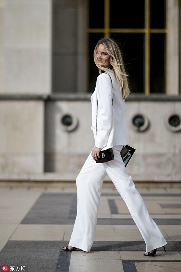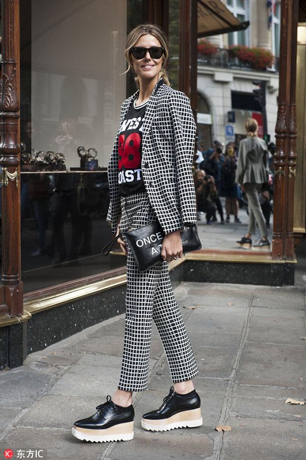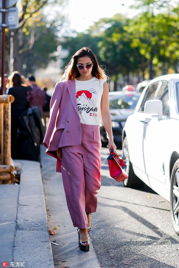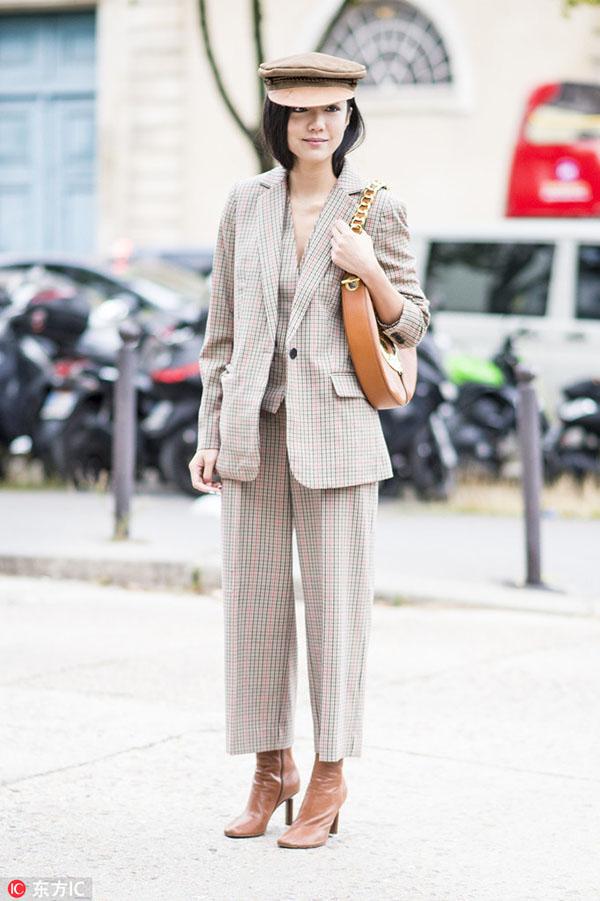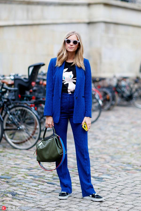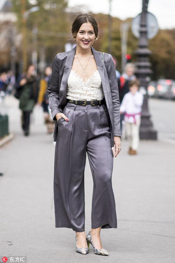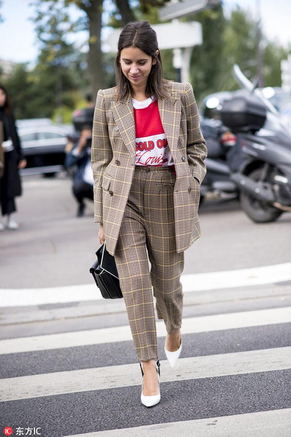 从夏天就一直火到秋冬的露脐Bra和上衣同样是搭配西装的绝佳单品。从休闲日装到精致晚装,西服套装内搭一件性感的露脐Bra或上衣,将超年轻活力款式成熟化演绎,让少女气的俏皮更具时髦感,同时刚柔并济的搭配,还能衬托出女性洒脱和自由的一面。 -- 印花T恤 想要摆脱西服套装的沉闷和古板,内搭的趣味性和色彩的选择举足轻重。因此一件色彩斑斓、又极富童趣的印花T恤就再完美不过了。不仅可以给穿着者带来随意的街头活力,还能给充斥着黑灰白的秋冬带去一抹绚丽的色彩,让你成为人群中最亮眼的那一个。 对色彩把握足够自信的妹纸可以选择彩色套装与T恤形成撞色混搭,会显得更加前卫时髦。 下半身搭配 -- 喇叭裤 想要干练但又不舍得完全摒弃性感的女生,可以优先选择喇叭裤套装。复古喇叭裤中间窄,裤腿宽的经典模板瞬间修饰并拉长腿型,勾勒出女人最美丽的部位。而2016喇叭裤更是被玩出了新高度,改良后的喇叭裤显得更为前卫时尚。在小腿部大开叉款或是将喇叭裤与N分裤相结合等都是2016最热的款式,一改喇叭裤经典的“拖地设计”,干练劲十足。初秋搭配上一条改良版的复古喇叭裤,绝对是要温度又要风度。 -- 窄版紧身裤 在2013年的YSL秀场上,热爱摇滚和颓废风格的设计师海蒂·苏莱曼(Heidi Slimane)将自己所擅长的窄版风格加入吸烟装,从此传统的吸烟装被赋予全新生命,在这个崇尚个性的时代再次绽放。如果你是充满个性的女孩,那窄版紧身裤套装就是为你私人订制。上宽下窄的搭配帅气随性,还能够有效修饰身材上的小缺点,欧美女性普遍身材比较魁梧,以此穿出了纤瘦感,作为亚洲女性身材比较娇小,也能用西装外套穿出气场。 -- 阔腿裤 想要让自己比别人时髦,潮流单品就一定不能放过。用阔腿裤来搭配西装穿着,会为你的办公室造型带来变化和新意。穿上阔腿裤的女人自信又洒脱,西装能让这种感觉更符合办公室的气氛,得体又充满魅力。对于腿部线条不自信的女生,阔腿裤正好可以扬长避短,修饰腿部线条。 对于个子娇小的女生,穿搭上最重要的是比例的调整和协调。上宽下宽的造型不适合娇小女生,因此搭配阔腿裤时,可以利用腰带收紧上半身或者将西服扣子都系好,强调腰部曲线。 或者选择七分设计的阔腿裤,露出纤细的脚踝,可以在视觉上拉身形,显得高挑修长。