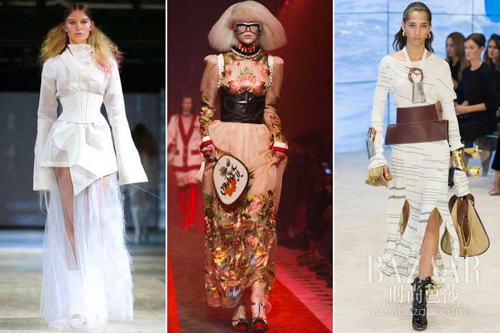 Dorhout Mees、Gucci、Loewe 2017春夏系列 复古的束腰腰封这一季也被重新搬上T台,并经过皮革面料来替代支架与蕾丝款式,打造符合现代审美的古典趋势,束出纤细腰身的视觉效果。并已成为一众时装精的必备,可以说是街拍大热单品。 腰部赘肉太顽固? 大热腰封还你小蛮腰