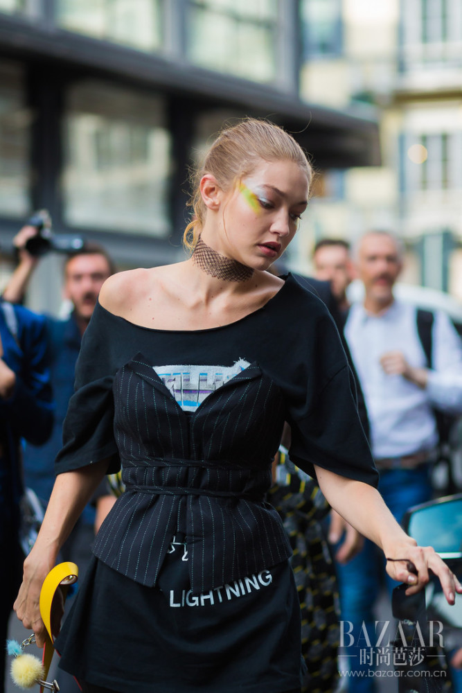 Gigi Hadid 束缚腰封+宽松T恤 Gigi在米兰春夏时装周上以一身黑色宽松T恤出现在街头,在同色束缚腰封的下低调秀出小蛮腰 ,加上露出的香肩,格外吸睛迷人。