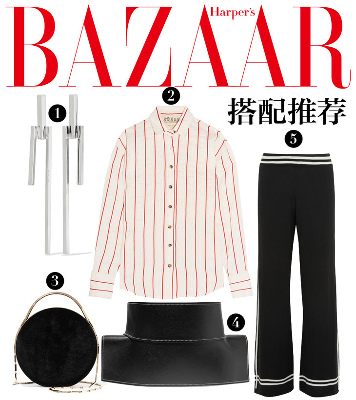 镀铑耳坠 Eddie Borgo 大廓型条纹提花衬衫 A.W.A.K.E. 皮革边饰天鹅绒单肩包 Eddie Borgo 皮革腰带Loewe 条纹羊毛裤 Chinti and Parker