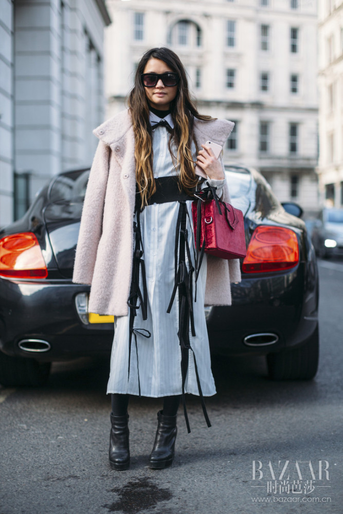 衬衫裙+漆皮外套 在腰带扎在及踝长的衬衫裙外,平衡冗长慵懒的造型,外穿挺括质感的漆皮外套,让你更具飒爽魅力。