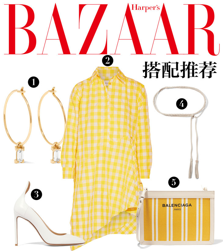 黄金钻石耳环 Ileana Makri 方格斜纹布不对称连衣裙 Marques Almeida 皮革高跟鞋 Francesco Russo 带穗饰编织皮带 Caravana 皮革边饰条纹单肩包 Balenciaga