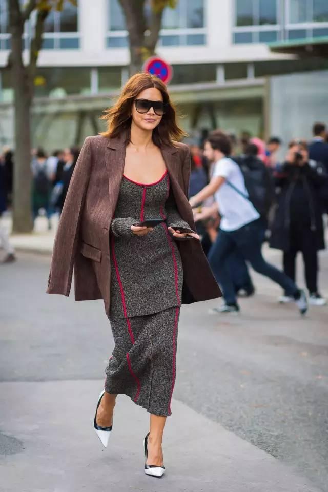 花灰色针织裙的穿法也很多,针织裙里面再搭一条裙子的“叠穿”穿法这一季正流行,如果觉得针织裙单调,可以这样穿来增加层次。