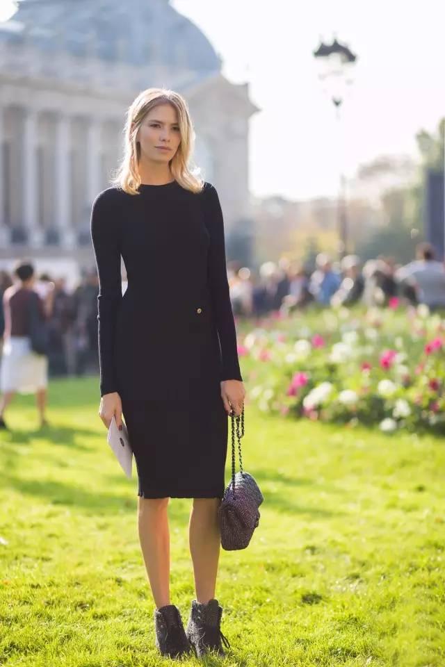 纯黑色针织裙也是很多明星和时尚偶像们的心头爱,曝光率很高。像Kendall Jenner 这件黑色针织裙简单但绝不普通,还很好搭,一双小白鞋就可以了。