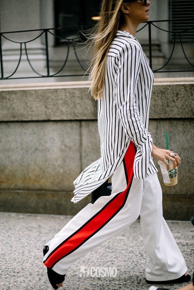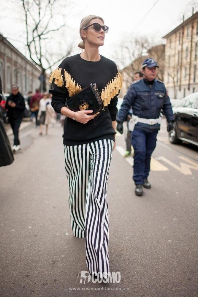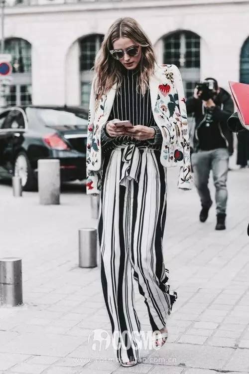 条纹阔腿裤 现在正流行的盖脚长度阔腿裤本就能让你长高“10cm”,再与竖条纹相结合,更是有无限延伸的神奇效果。
