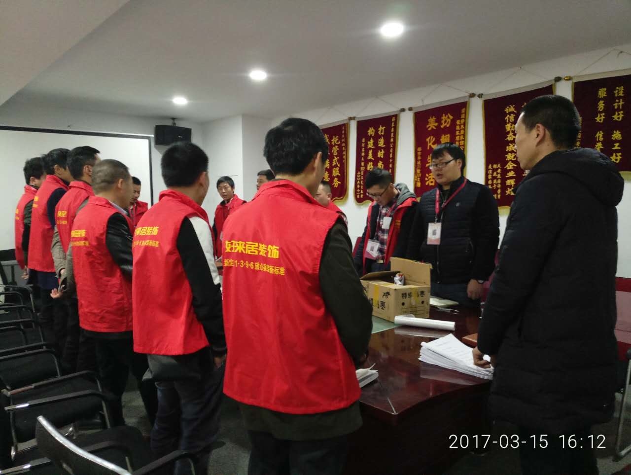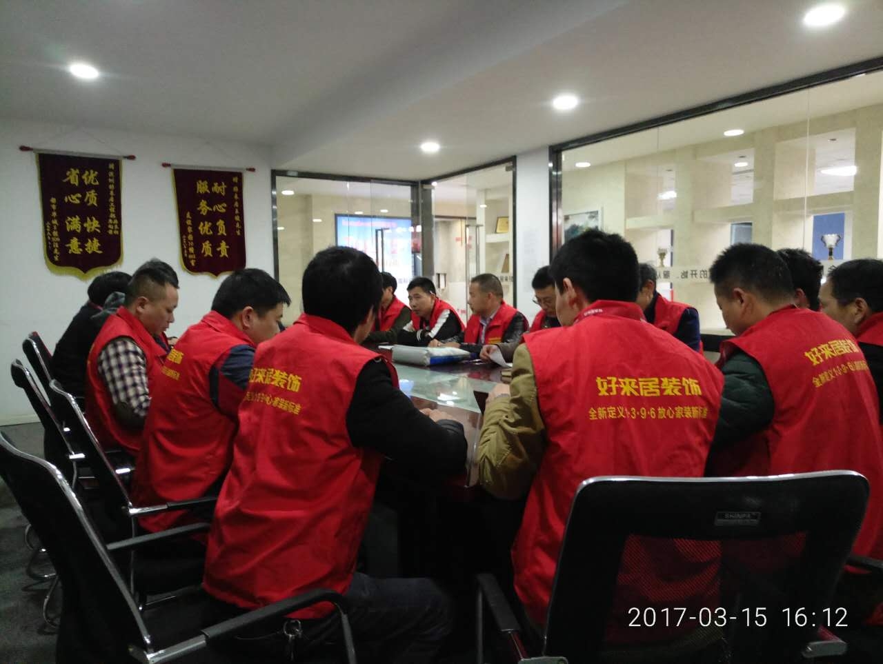 * T6 B$ E+ y% F3 Y5 ^+ e) V 13年来,“为家、为爱、为生活”的好来居家装理念逐渐深入人心,“好来居”也由当初一个名不见经传的小公司发展成为如今南通市场上的知名家装企业。 在濠西路99号的尚德城邦B座二楼,好来居装饰公司1000余平方米宽敞气派的办公场所里,设计部、工程部、财务部、接待厅内,身着职业装的好来居员工们有条不紊地忙碌着。会议室里,工程部的员工正围坐在一起,召开每周一次的例会。