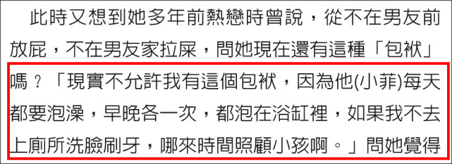 基本上,为了能够早点回家带孩子,大S连妆容都不想补,反正杂志都会后期修图,她还不如节省时间快点拍完,结束工作。 如果大家还记得的话,大S在谈恋爱的时候曾经讲过,为了维持淑女形象,她没有办法在男朋友面前放屁,也无法在对方家里大便,可是如今,为了争取时间照顾两个孩子,她会在丈夫面前上!厕!所!