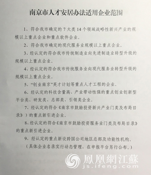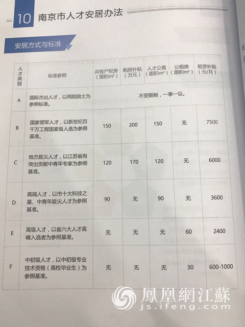 为更好地吸引和留住各类优秀人才在南京创业创新,南京将实行人才安居办法,为中高层次人才和广大的高校毕业生提供住房保障。2017年4月25日上午,南京市市长缪瑞林在第十届留交会上宣布《南京市人才安居办法(试行)》(以下简称“办法”)正式发布。 当日下午,南京市政府召开新闻发布会,南京市房产局、人社局、发改委等多部门负责人对办法进行联合解读。凤凰网江苏从会上获悉,办法将从7月1日开始实施。 根据南京市住房保障和房产局局长郭宏定在会上的介绍,“十三五”规划接下来的四年内,南京市大约将有16万人享受人才安居政策。 那么,哪些人才适用于人才安居办法,不同类别人才的安居标准又是什么? 适用人才五年内在宁无房屋交易 人才安居是指政府使用财政资金或提供优惠政策,为本市经济社会发展所需的人才提供住房保障的活动。 南京市人才安居的适用对象应符合以下条件: (一)在《南京市人才安居办法适用企业范围》中在岗在职人员。 (二)符合《南京市人才安居办法适用对象(目录)》中的A、B、C、D、E、F类人才的认定条件。 (三)本市户籍,且住房未达本办法确定的安居标准或非本市户籍、在宁无自有住房,且在本市5年内无住房登记信息和房屋交易记录。 六类人才享有不同安居标准 根据办法的规定,享受安居政策的人才分为A到F六类。其中: A类人才和在本市承担国家(国际)重大项目的人才,实行“一人一策、一事一议”。 B类人才可申请150平方米左右的共有产权房或人才公寓;申请购房补贴的,补贴标准为实际购房金额的50%,最高200万元;申请租赁补贴的,补贴金额为每月7500元。 与B类人才相似,C类人才同样可以选择申请共有产权房、人才公寓、购房补贴和租赁补贴中的一种安居方式,实物配置和货币补贴的标准略微下降;D类人才及以下则不享受购房补贴。 高校毕业生被划分为F类人才。取得全日制大学本科及以上学历并获得相应学位的国内外高校毕业生,毕业2年内在宁就业且签订1年及以上期限劳动合同,或在宁自主创业,缴纳企业职工社会保险后,可申请面积为30平米左右的公共租赁住房或600-1000元的租赁补贴。 房源来自哪里? 《办法》指出,人才安居住房以区、园区等产业载体建设为主。江北新区及开发区、其他产业载体等投资新建、购买、租赁是房源筹集的渠道之一。 南京市住房保障和房产局局长郭宏定在会上介绍,用人需求集中的地方将是共有产权房、人才公寓和公共租赁房建设的重点区域,例如,江北新区作为创业创新的热土,将成为建设该类房屋和相关配套的集中区域。 新引进的、投资规模大的、产业层次高的企业,在满足城市规划的前提下,经批准,可以专项配套建设人才公寓和公共租赁住房。 政策如何兑现? 人才安居政策需由企业负责申请。各类适用人才需对照认定标准向企业提出申请。 先进制造业、现代服务业、战略性新兴产业将得到人才安居政策的重点支持。凤凰网江苏注意到,人才安居鼓励创业创新,新创办的企业,如符合南京市产业发展方向,属于《南京市人才安居办法适用企业范围》,即可申请。 人才通过审核后,实物安置由区(园区)房产部门或房源管理单位配售(租);货币补贴直接发放到人才个人账户。 此外,人才安居申请的政策享受期为5年,其中共有产权房、购房补贴只能享受一期;人才安居政策最多享受两期。(张珏婷) http://js.ifeng.com/a/20170425/5610955_0.shtml