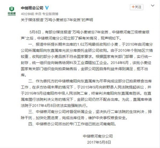 中储粮光武分库正在组织车辆将已经变质的小麦运走。来源:中新网 5月8日晚,中储粮总公司官方微博发布声明:有部分媒体报道“万吨小麦被忘7年变质,中储粮河南三级粮官噤声”之后,中储粮河南分公司立即了解有关情况,现声明如下。 一、报道中所提长期未出库的1.62万吨最低收购价小麦,于2010年由河南分公司所属南阳向东直属库光武分库委托金硕公司收购。由于2010年个别地区灾情较重,收购的部分小麦品质不符合国家要求。根据国家有关部门部署,实行统一封存,统一组织定向销售给饲料及工业酒精加工企业。2014年6月,该批小麦经国家有关部门组织定向拍卖销售后,金硕公司因自身利益未得到满足,拒不出库。 二、作为委托方的中储粮南阳向东直属库为尽早完成这部分已拍卖粮食出库工作,在多方协调未果的情况下,于2015年9月向新野县人民法院提起诉讼,并于2016年9月经南阳市中级人民法院二审,终审判决南阳向东直属库胜诉。在直属库履行法院判决义务的情况下,金硕公司仍然不配合出库。为此,直属库申请法院于2017年4月8日依法实施强制执行。 三、中储粮河南分公司将督促所属企业,坚决执行二审法院的生效判决,排除干扰,加快处置进度,完成出库任务,维护中央事权粮食安全。 四、中储粮总公司派出的专门工作组已抵达河南南阳。  南通0 |