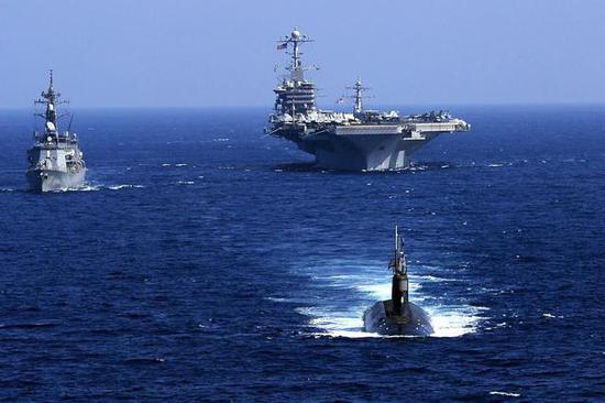 资料图:美航母编队 海狼级核潜艇最引以为傲的地方就是它极高超的隐形能力。其艇身设计得平滑简洁,有利于减小流体阻力和噪音。在潜艇的帆罩前面,专家还特别加上了一个倾斜的弯角,借以削弱海水经过帆罩时引发的噪音。与此同时,海狼级核潜艇更运用了主动降噪减震技术和双重减震平台,进一步降低震动与噪音。此外,26个散布于艇体的侦测器,也能随时监测、修复噪音来源。