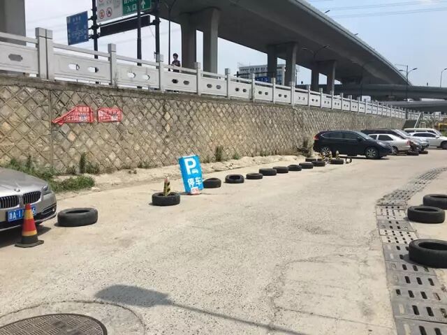 记者在一长排轮胎中找了个空隙停进去,倒没见人来问我收费。不过车位边真有一块蓝底白字的铁牌子,上头一个大写的“P”,下面还注明“停车、住宿”,牌子不远处是一张饱经风雨的小板凳,看着很像是收费员的座位。