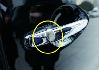 很多车主自己开车出门时,很少会留意到车后门的情况。当你看到车后面把手上塞上一枚硬币时,则表明车辆很有可能被不法分子“盯上”了。这枚硬币的作用就是卡住车门,使车门不能锁好门,当车辆开出去后再开回来停在那里,那不法分子就能轻松进车盗窃了。 & `' |! }! e% i4 P j