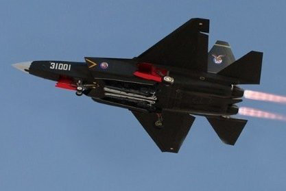 歼-31,代号“鹘鹰”,是由中航工业沈飞集团研制的具有自主知识产权的第五代双发中型隐形战斗机,2012年10月31日上午10时32分,歼-31首飞成功,2014年11月,歼-31首次亮第十届中国珠海航展并进行飞行表演。该机外形采用波束控制理论设计,机头、机身呈菱形,采用单座、双发、外倾双垂尾、全动后缘前倾平尾的布局,两侧布置DSI进气道,配置内埋武器舱,据珠海航展上相关的介绍,该战斗机起飞重量为17.5吨,机长16.9米,高4.8米,翼展为11.5米,机翼面积约40平方米,不加油作战半径达1250公里,携带副油箱时可保证作战半径达2000公里,最大速度可达1.8马赫,带弹最短起飞距离400米,最短着陆距离600米,机体整体大小介于F-15和米格-29之间,与美国F-35大小基本相当,采用全黑色机身,应用大量复合材料,表面涂覆了大量隐形涂料。