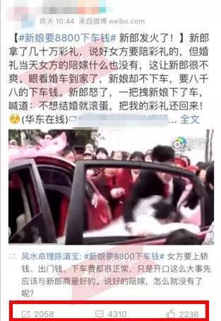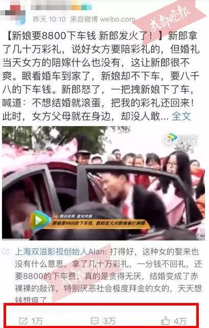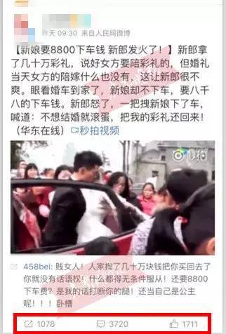 昨日开始,一段“新娘要8800下车钱 新郎发火”的视频火了,视频称新郎拿了几十万彩礼,女方一分陪嫁也没有。婚车到家,新娘不下车还要8800的下车钱。新郎怒了,一把拽新娘下了车,喊道:不想结婚就滚蛋,把我的彩礼还回来!