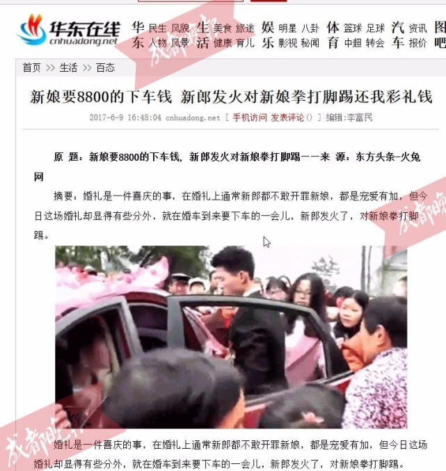 成都晚报(微信号:CDWanBao)记者梳理该条新闻报道发现,大多数转发的媒体来源标写为“华东在线”,成都晚报(微信号:CDWanBao)记者搜索看到,华东在线于6月9日下午在其网站上发布了一条名为《新娘要8800的下车钱,新郎发火对新娘拳打脚踢还我彩礼钱》的新闻,来源显示为东方头条—火兔网。百度百科显示,华东在线是南昌某网络传播有限公司旗下一家综合类资讯网站,成立于2010年。