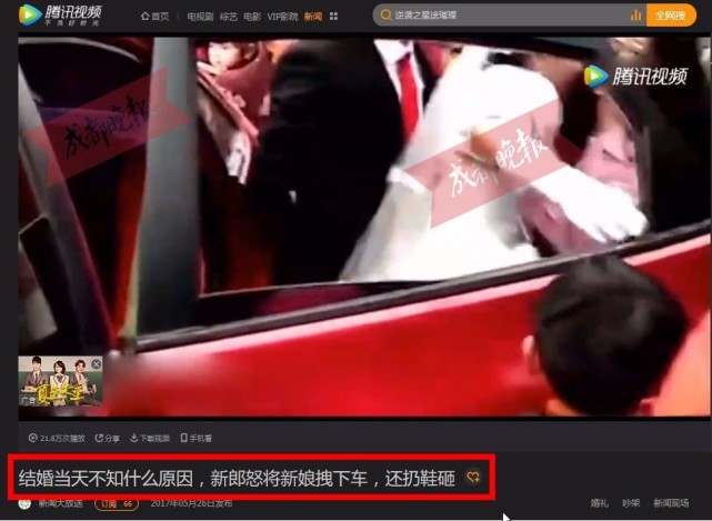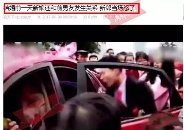 疑点重重 视频存在多个版本 在网友一边倒指责新娘,支持新郎的同时,成都晚报(微信号:CDWanBao)记者还发现,有许多网友提出了质疑:“从五月底开始就看过这段视频,好多个版本,到底哪个是真的?” @ccccwwwwssssff:从5月底就看这视频在网上传了,三个版本,一,新郎看到艳照视频,二,女方还有个私生子到了现场,男的才知道,三,男的私生子,女的不同意一起扶养说了难听话,男的暴怒,加今天这就四个了。 @我是超先森:我上次看的时候怎么是说新娘结婚前一晚还去和前男友上床,结果第二天前男友把视频发给了新郎。 @小贤珍珠铺:吃瓜群众,两个版本到底哪一个才是真的 @扑克牌桃子:好多种版本,有谁知道到底事实真像是什么,还有新郎的彩礼是多少 成都晚报(微信号:CDWanBao)记者随后搜索发现,从17年5月开始,同一段视频就在网上被发布,所配旁白则是“五花八门”,有不知道什么原因新郎拽新娘下车,并用高跟鞋狠砸;也有比较中性的新郎突然发火狠狠拽出新娘的内容,此时网友的评论大多为“指责新郎,劝诫新娘不要结婚”。