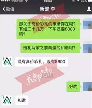 成都晚报(微信号:CDWanBao):发生争执是否因为索要8800下车费? 新郎小李:婚礼的事,两家人商量得很和谐,完全没有高价彩礼和下车费8800的说法。