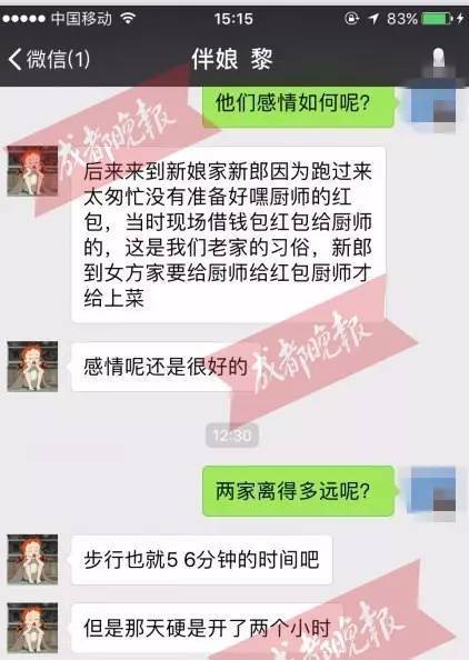 据了解,新娘小邹和新郎小李是四川省资阳市安岳县人,都是90后,两家距离很近,走路不到十分钟。两个人目前都在浙江上班,相恋已有4年,感情一直很好,两家关系也不错,婚礼定于2017年1月30日在安岳老家举行,当时的主婚车由其亲戚从浙江开回老家的。 记者与新娘聊天记录