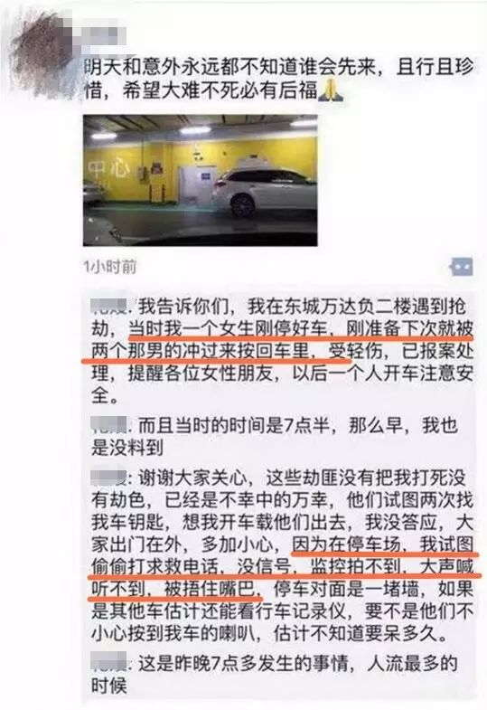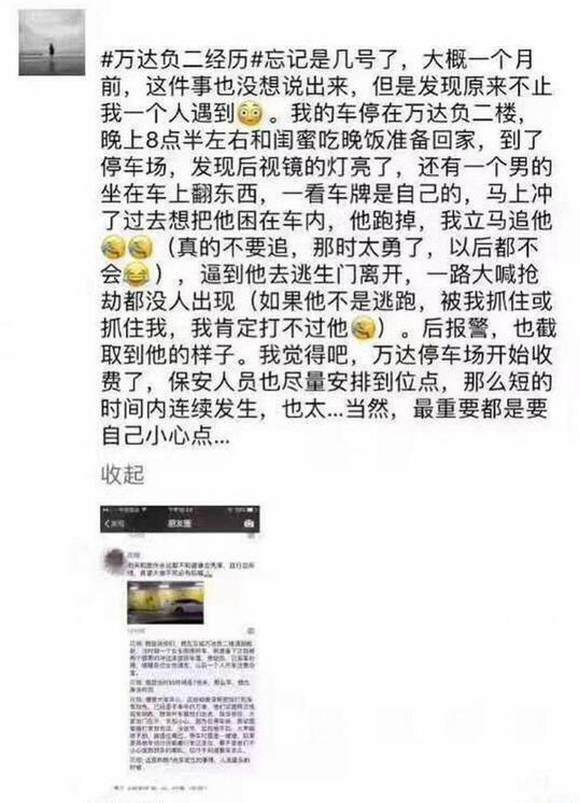 ' o$ `! V- H$ c3 S0 N4 T, A甚至也有其他的网友自述了同样发生在东城万达广场负二楼停车场的类似遭遇。