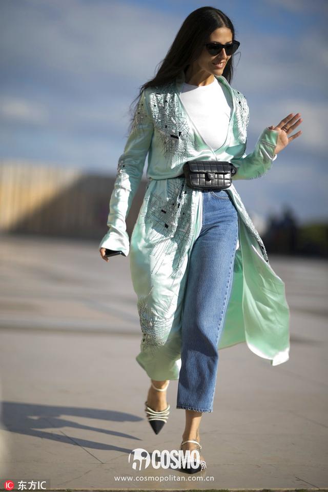 这种精致小巧的挎在腰间,非常亮眼。 2、把腰包当做配饰来戴,不要真的当做包来用