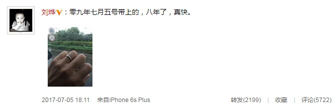 刘烨结婚8周年晒婚戒:09年戴上的,8年真快! |