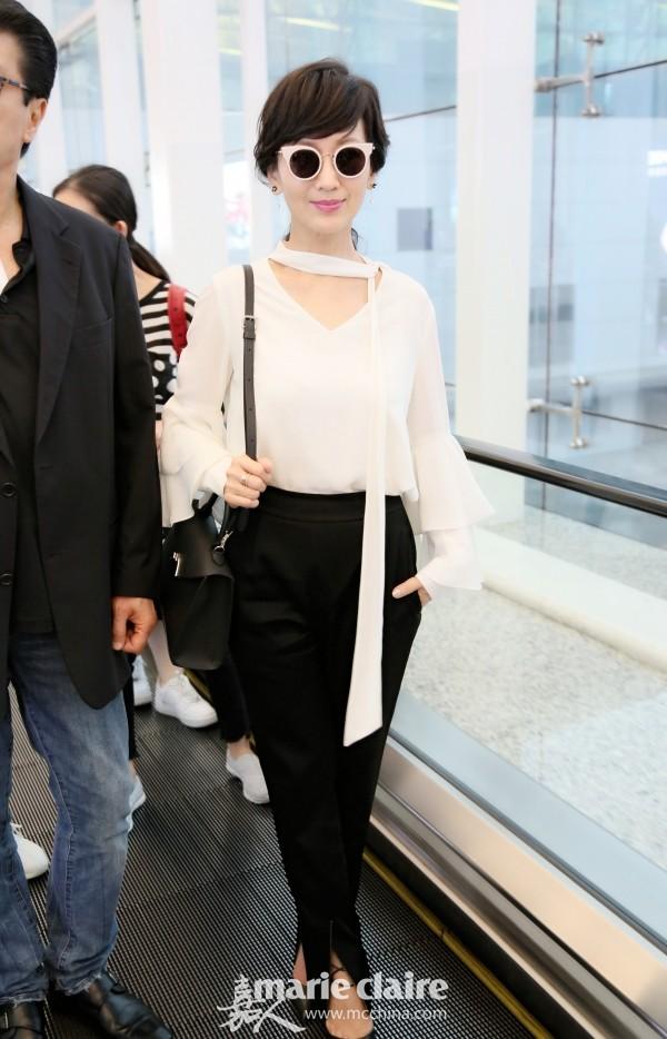 佟丽娅戴黑色Choker,身穿黑色天鹅绒抹胸,下穿黑色九分西裤,系黑色腰带,脚踩银色亮钻高跟凉鞋。
