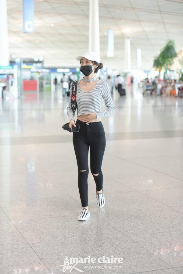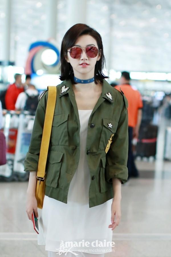 景甜机场街拍。她戴Gentle Monster粉色镜面墨镜,戴孔雀蓝Choker,身穿Dazzle徽章刺绣军绿色夹克,内搭Givenchy白色半透视长裙,脚踩ISERIES小白鞋,肩背Roger Vivier方扣黄色麂皮单肩包。
