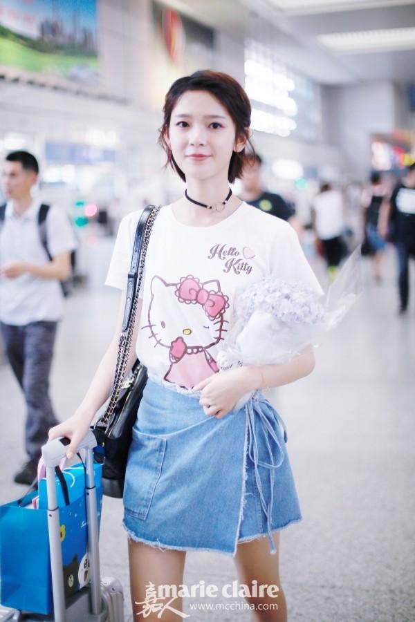 陈瑶时尚街拍。她身穿金属环Choker,身穿Hello Kitty卡通印花白色T恤,下身穿牛仔毛边围裹半身裙,脚踩Yeezy白色运动鞋,肩背Chanel黑色流浪包,手推银色行李箱。