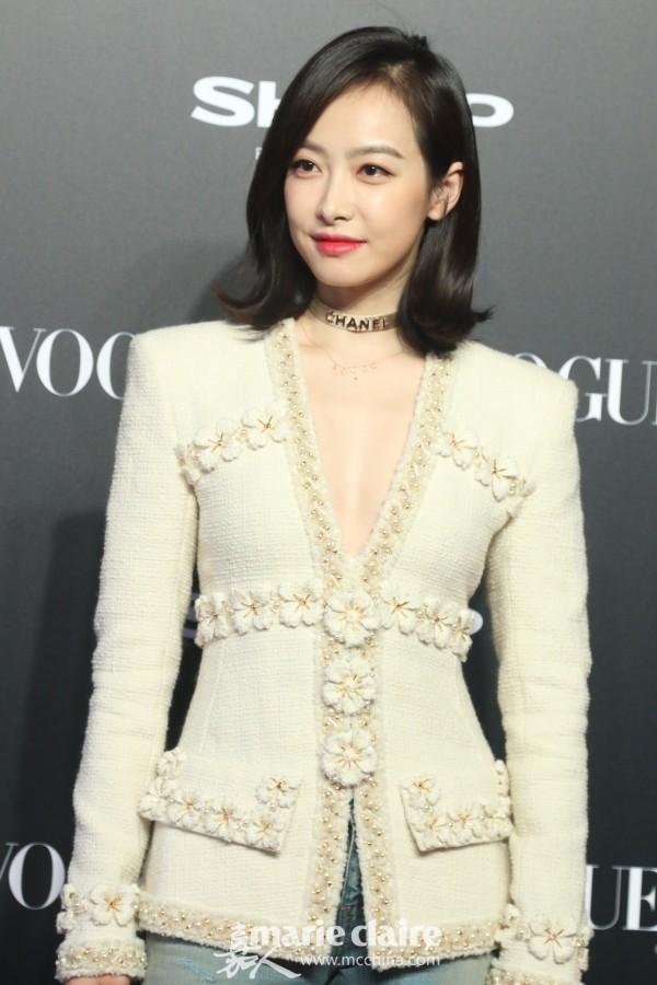 宋茜戴Chanel金色字母金属Choker,身穿Chanel 2017早秋高级定制系列山茶花珍珠深V粗呢西装,下身穿破洞不规则裤脚边牛仔铅笔裤,脚踩黑色尖头高跟鞋,手拿Chanel头像印花木质手拿包。