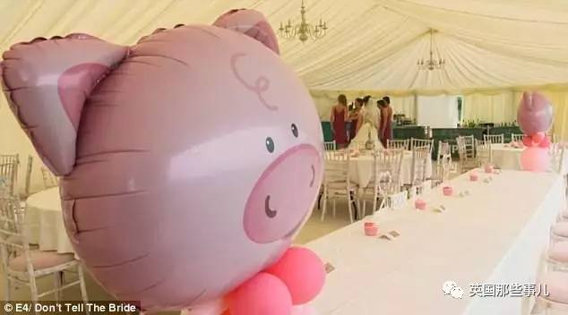 惊喜4. 婚礼的用餐区也装饰着猪猪气球,连蛋糕也是花了250英镑定制的猪猪蛋糕。