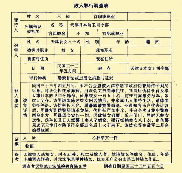 案例三:直接强征中国妇女 如前所举案例,“慰安妇”的征募并非民间行为,只是被伪装成了民间行为。 有时候,侵华日军也会放弃伪装,直接在中国强征“慰安妇”。如下面这份档案所示: 1946年5月天津地方法院填报的《敌人罪行调查表》