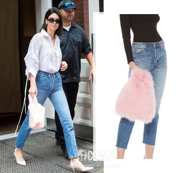 肯豆之前就有拿着她家的粉红毛毛手袋出街,衬衫、牛仔混季节搭配毛毛包,清新之余又很是可爱。