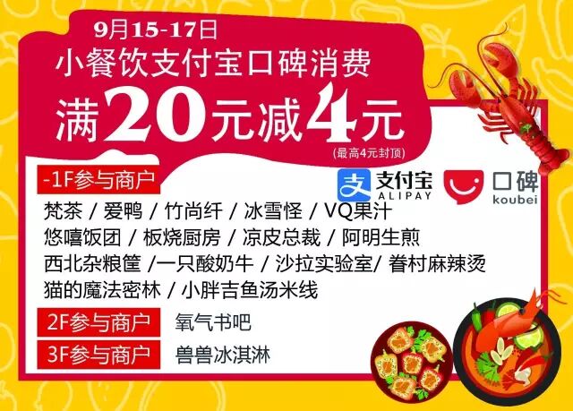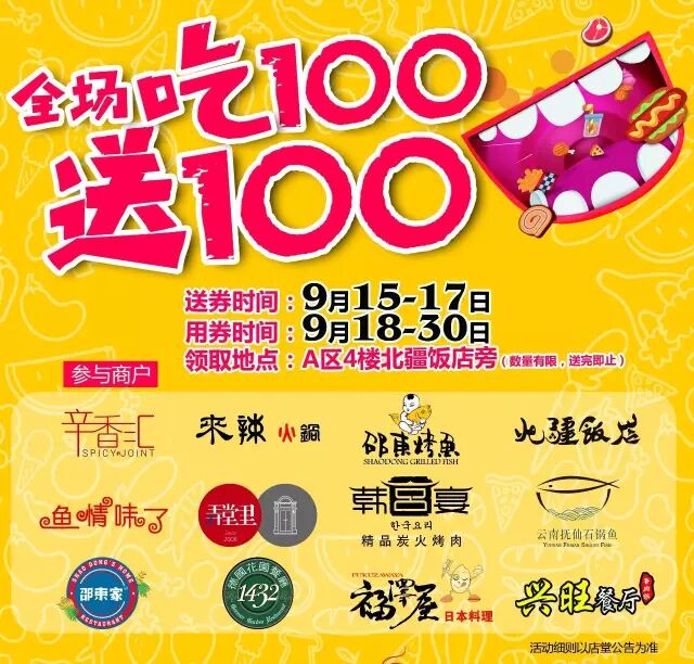 1 Zui“壕”生日会 9月15-17日 在文峰城市广场指定餐饮 全场吃100送100,这是“免单”的节奏?! 小餐饮也不甘示弱,联手支付宝 给你优优优优优优惠