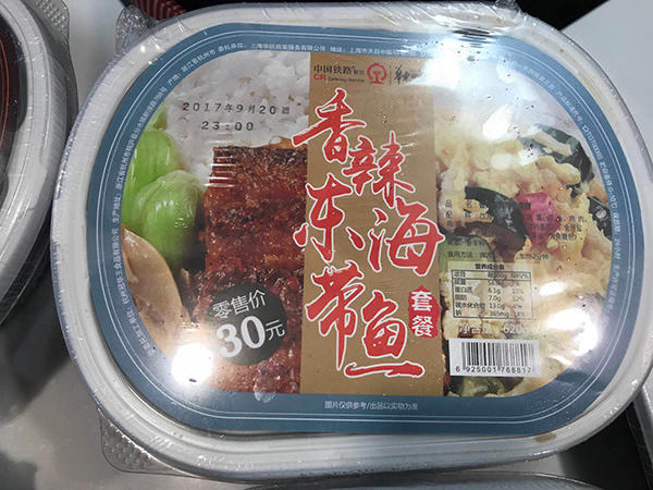 复兴号上吃得咋样? 盒饭分4档,从15元到60元都有;还有8元到15元的鸡肉卷、三明治、水饺和粽子。 9月21日零时起,全国铁路实行新的列车运行图,7对“复兴号”动车组列车在京沪高铁线率先实现350公里时速运营。 当日上午,澎湃新闻(www.thepaper,cп)记者登上上海始发的复兴号,发现列车上餐饮丰富,明码标价,铁路部门推出多项新举措,服务旅客出行。 盒饭分4档,从15元到60元 复兴号上餐饮介绍图。
