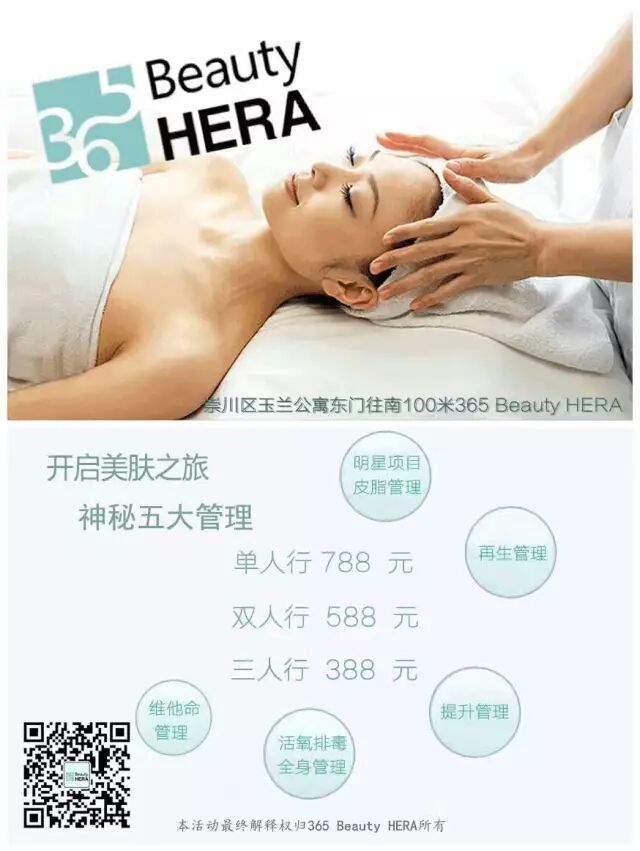 开启美肤之旅,神秘五大管理: 明星项目 皮脂管理 再生管理 提升管理 活氧排毒全身管理 维他命管理 单人行 788 元 双人行 588元 三人行 388 元 南通0 |