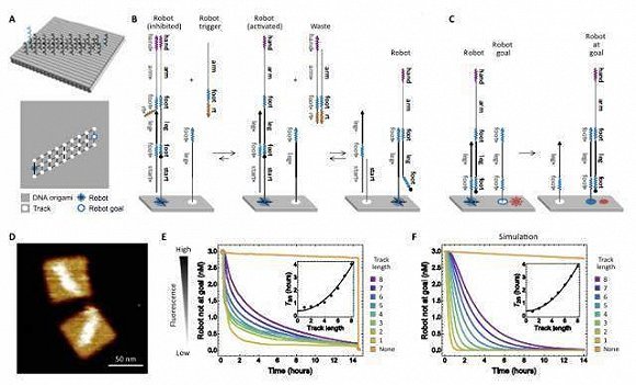 该团队由该校的前研究生Anupama Thubagere和华裔科学家钱璐璐领导。研究人员构建了组装DNA机器人的三个基本构建模块:一条拥有两只“脚”的“腿”,用来“行走”、一条带有一只“手”的“胳膊”,用于提取货物,第三个被添加的部分可以识别特定的下落点并向手指发出讯号。这些部分是由单链DNA内的几个核苷酸构建而成。 理论上说,这种模块化的构建方式可以使机器人组合成许多不同的形状以满足不同任务的需求。例如,可以使用具有若干只手和胳膊的DNA机器人同时携带多个分子。 测试中的DNA机器人