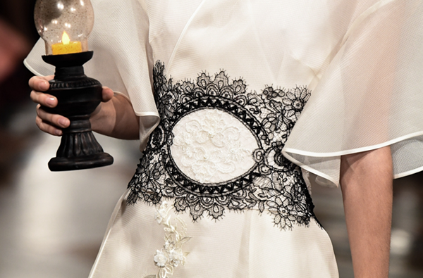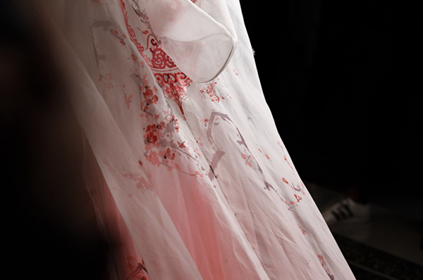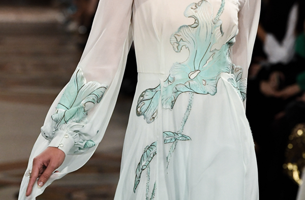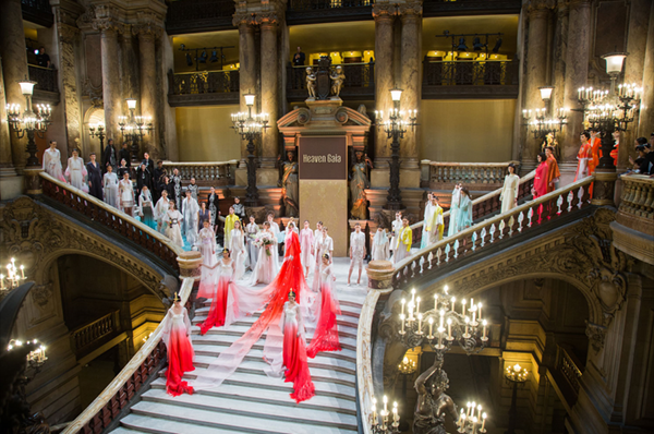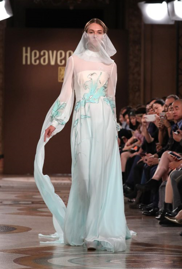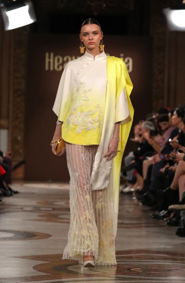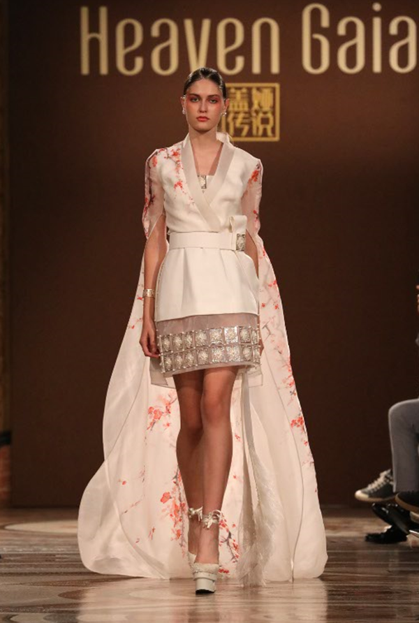 为将东方的美与艺术分享给全世界热爱美的知音们,去年10月5日,HeavenGaia盖娅传说•熊英首次登陆巴黎歌剧院,开启了一场震撼世界的中国顶级服饰文化享受。今年则在去年“启”的基础上,以“承”为大主题,将中华文化中传颂不衰的“四大美人”(西施、貂蝉、王昭君、杨贵妃)的故事辅以传承中国智慧的美学以及岩画、晕染、吊染、苏绣等精湛的传统服饰工艺,将那千百年来道不尽的良辰美景、诉不完的玉貌芳华变成了一件件栩栩如生的华美服饰,于拥有150年历史依然辉煌璀璨的巴黎歌剧院内呈现了这场东方融汇西方、内在结合外在、震撼感官与灵魂的视觉盛宴。 “女性的一生都在孕化生命、孕化美、孕化爱,所以我们用古代的四大美女去衔接古远,承接当下,指引未来……”依照品牌创始人兼设计师熊英女士的设计梦想,Heaven Gaia盖娅传说•熊英2018春夏大秀分成四幕:初见(西施)、问情(貂蝉)、醉梦(贵妃)、相思(昭君)……每一幕都拥有超越国度的艺术之美。能够与之相配的艺术典藏之作必然也是承传着中国古老技艺的佳品。Heaven Gaia盖娅传说·熊英2018年春夏系列巴黎秀选择了萃华珠宝作为最佳合作伙伴。作为传承百年的皇室珠宝品牌本次专程为盖娅传说特别定制了与大秀主题匹配的首饰及各种配饰,其中“龙腾盛世”头饰还获得了首届“紫禁城”杯中华老字号文创大赛特别金奖。饰物采用中国非物质文化遗产——花丝镶嵌及錾刻工艺,通过细如发丝的金丝,和翊翊如生的錾刻,将极具中国文化特色的民族元素,以时尚现代的表现手法演绎出来。传递中国美学文化已经成为每一个拥有“中国精神”品牌的使命与宿愿。 初见西施 亭亭而立,玉露清愁 “亭亭玉荷,悠含昨夜清露……”中国人自古喜欢用荷花比喻美人的清丽、高雅。在初见(西施)系列中,便可窥见许多取用荷、鹤元素,寓意“和美”的改良云纱秀荷服。 传统工笔绘画融合壁画着色技巧,在薄纱上进行图案块面式表达,局部结合苏绣工艺,装点玉露水滴,达到清荷在薄雾间含露亭亭玉立、云鹤悠然在荷间仙舞的幻妙画卷。 清丽女子似花,服饰意境如叶,用创意立裁的手法最多拼接达到176片,且每片拼对都采用水墨韵染,以龙骨化叶脉、青纱作叶片、玉滴点清露,女子在立体清透的青荷叶片应衬下更显优雅含蓄。 服装细节图 这一系列还可寻见采用艺术泼墨的印染手法,后期进行压褶处理,褶皱连接处采用镂空花边镶印工艺,在中式直裁中寻找一种衣物平面与立体的空间效果,达到哲思韵律。定制中式圆型图腾与西式浪漫蕾丝工艺相融合,并采用中式旗袍的构架,融合西式简裙的线条收身,无缝的工艺保障了图案的完整与纯粹,在墨染黑兰中寻找另一种知性与宁静。 问情貂蝉 花枝繁华,明月如霜 牡丹、鸢尾、雅兰、桃花……问情(貂蝉)系列中可以看到众多花卉图案,领口衣角处均用中式回纹穿插于百花之间,犹如凭栏之间的百花齐放,与腰间手臂的圆型装饰形成对比,方圆之间意趣盎然,花卉采用勾线、卡缂花的方式刺绣后,再进行盘银勾勒,花朵之间采用贝壳珍珠、水晶石等进行装饰,层层衣摆白纱间好似清晨薄雾下花开凭栏处,唯美浪漫。 服装细节图 定制中式经典构架的花卉图案与西式蕾丝工艺融合,制成后全身采用青紫色系苏绣花卉再次叠加,再根据层次进行全身珠绣并在袖口底摆进行珠串装饰,整件衣服晶莹剔透,似有似无的花卉如青紫云霞环绕在衣间。行走间,一步三摇,步步生香。 手工绘制白色花卉于轻透丝纱上,如同结霜花境。局部采用多层彩绘,达到七彩霞光的意境,并饰有手工晕染绢花。运用西式“收腰▪扩摆”的裁剪技巧,让每件衣服都富有诗意。在浅黄色衣料上进行水彩花朵手绘,结合局部刺绣,提亮花的色彩和光感,并结合立体钉珠装饰与衣边编结装饰,不破坏水墨画幅本身的构图与留白,用衣服结构与寻找画幅的比例达到以衣为纸、衣间作画的效果,整体清雅简约。 醉梦贵妃 水袖丹衣,回眸百媚 醉梦(贵妃)系列采用中国古代宫廷的明黄色调,与牡丹、菊花等华贵花卉,在丝光锦缎上使用明度肌理不一的各色棉花、丝线进行立体栽绒丝带刺绣,高低疏密色彩规律有序,在经典廓型间尽显肌理营造的美感,体现花开富贵的大唐盛景。 延续东方大唐的色调与华丽感,重新运用纳纱等复古设计,并融合欧式廓形与贵族塔夫领型,在中式华贵与西式华贵之间来回碰撞。面料局部采用窗镜式镂空拼接丝纱,并进行无缝连接式刺绣在实与虚的面料中多手法,穿插刺绣,让绣本身融入衣料,并加以局部勾金等手法,如同烫金的视觉效果,人体在窗镜镂空中闪现。花卉与贵妃游春图更是悬浮于窗镜之上,仿佛千年前繁华就在昨日,整体艳丽高贵,不可方物。 服装细节图 相思昭君 琵琶遮面,尽随风逝 相思(昭君)系列以黑色底料为主,衣身进行对比鲜明的白银刺绣,琵琶图腾融入其中,附一厢思念,承一世和平,这琵琶遮面、尽随风逝的是对寒梅的恋想。 服装细节图 采用浓烈的古色系湘妃红与雪白进行组合,通过丝毛等轻飘面辅料呈现出远赴塞外、寒梅抒情的时景。含情挥笔冬梅,寻八荒安宁。加以琵琶挂饰与此景结合,无不体现出昭君的俊美丽质与绝世才貌。 Heaven Gaia盖娅传说•熊英由中国著名服装设计师熊英及联合创始人王婷莹女士共同创立。品牌从创立之初起便始终致力于将原创精神转化为独特的服饰