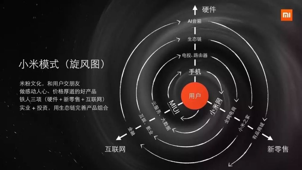 小米定位:硬件+新零售+互联网 小米在2010年创办,创办小米的目的其实很简单,主要是想看怎么用互联网的思维和互联网的方法论帮助中国制造业转型升级。 小米可能会突破以前商业模式包括定位的很多思考,很多人批评小米是不专注的公司。我要说的是,小米是一家手机公司,也是一家移动互联网公司,更是一家新零售的公司。