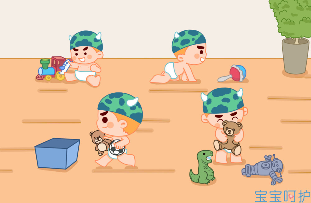 6-8月的宝宝:爬行训练 大多数宝宝在6-7个月时就有爬的欲望了,虽然这个时候宝宝们爬行的动作还非常笨拙。宝宝刚开始学爬的时候,只能蹭着地面旋转、后退,不能向前爬。这时候爸爸妈妈可有意识地教宝宝练习,将宝宝俯卧在床上,在宝宝前面放置一些颜色鲜艳或者带声音玩具来吸引宝宝的注意力,诱导宝宝前行。经过一段时间练习,8-9个月宝宝的爬行动作就能发展成为:身体离开表面,双手前后交替标准的四肢爬行方式,即用手和膝盖爬行。在宝宝撑起四肢在爬行的过程中,锻炼了胸腹背与四肢的肌肉,这样就为日后的站立打下了良好的基础。