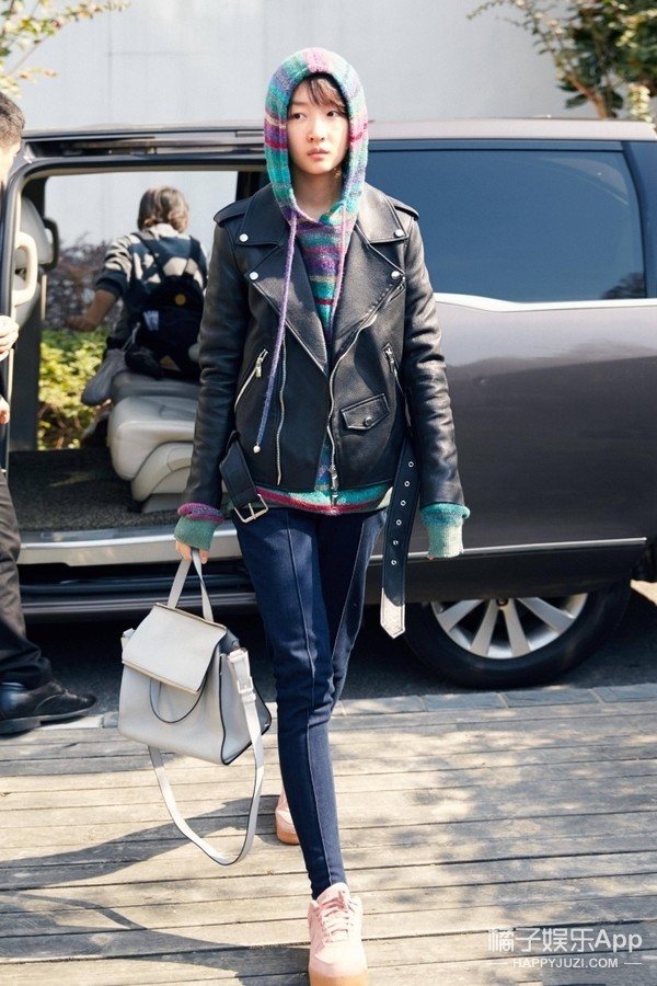 小个子星人冬叔以彩色条纹帽衫搭配黑色皮衣,脚踩粉色球鞋。整个look帅气又不失俏皮感,白色的魔方包注入简约质感的同时也点亮了整体造型。