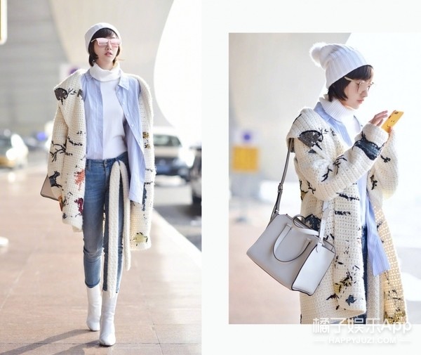 景甜则用清新的色调实力演绎冬日清爽穿搭,肩背的魔方手袋与白色针织外套、短靴相呼应。不同质感面料的组合丰富了整个look的层次性~