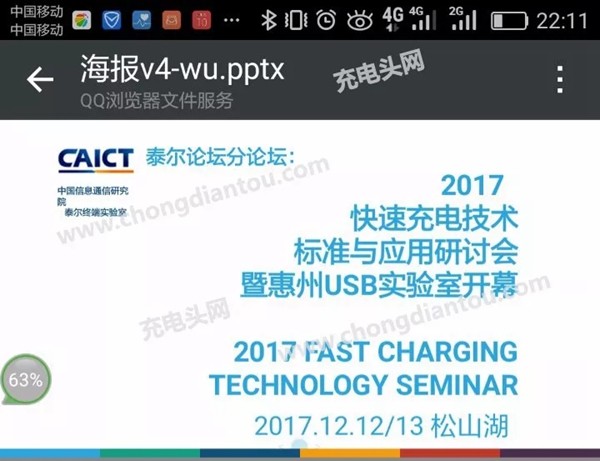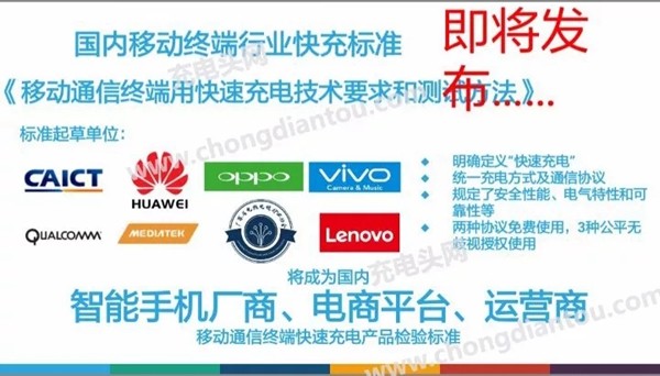 由于没有统一的规定,因此各大手机厂商,供应链均推出了自有快充标准,国际知名的例如USB PD、高通QC等,在国内数量更多,华为Super Charge、魅族mCharge、OPPO VOOC等更是繁杂,尽管用户采用原装充电器能够保证充电速度,但如果应急充电可能最高只能在5V 2A左右了。 据充电头网报道,其获得的消息显示工信部旗下泰尔终端实验室发起的《移动通信终端用快速充电技术要求和测试办法》即将发布,该办法将明确定义“快速充电”,并统一充电方式及通信协议,规定了安全性能、电器特性和可靠性等,并透露两种协议免费使用,3种公平无歧视授权使用。