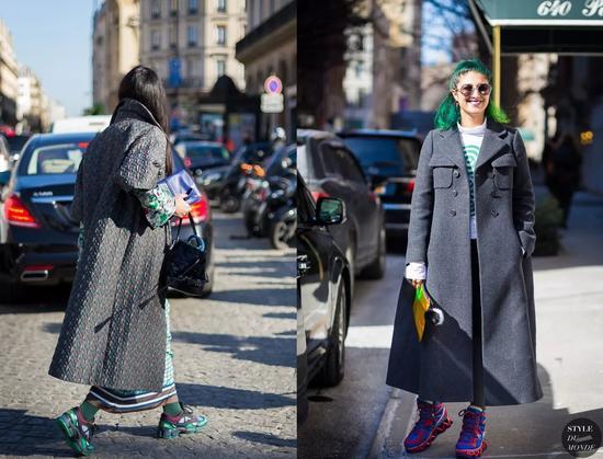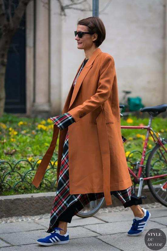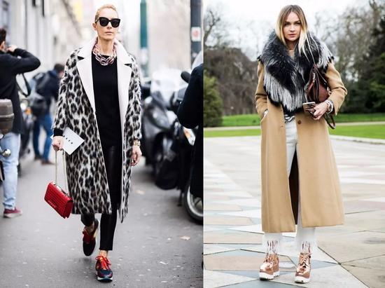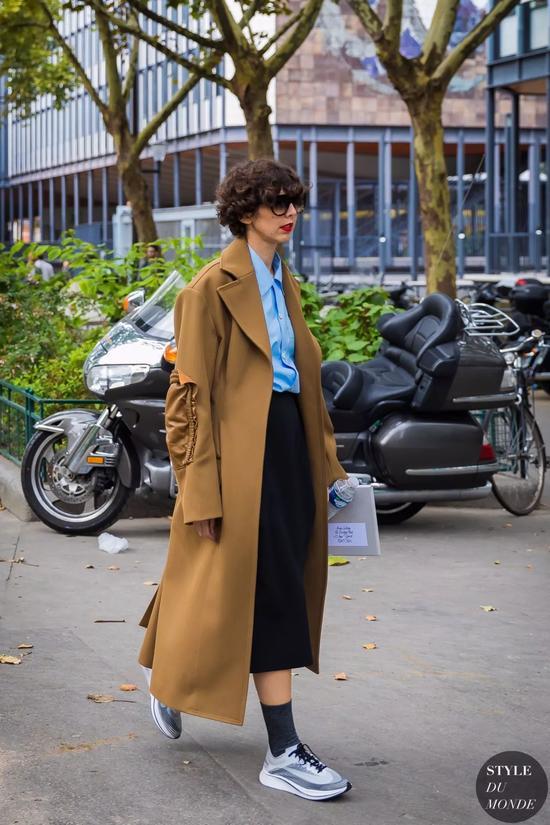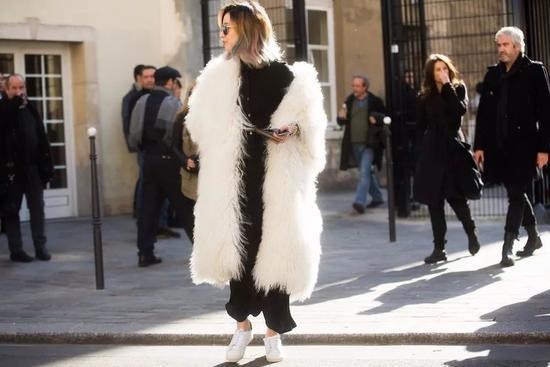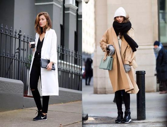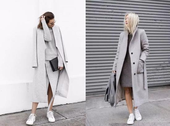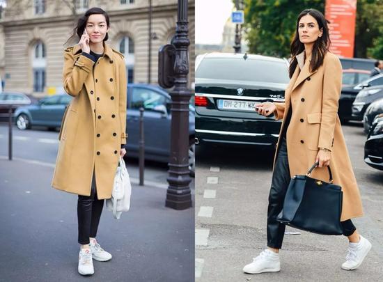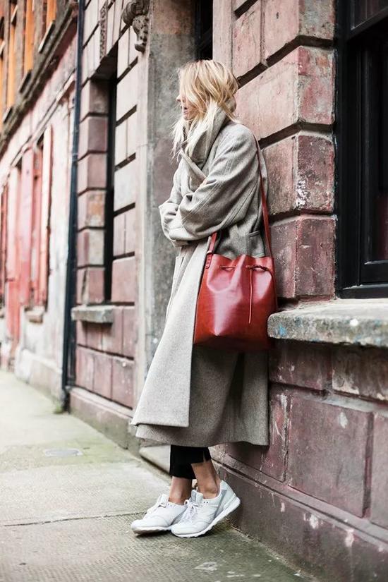当选择一款超长的大衣出街时,不用考虑什么,就是小白鞋了!