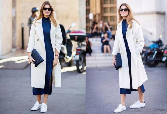 穿白色大衣时真该试试搭小白鞋是怎么样的体验,不失优雅却更活泼,即使是藏蓝色连衣裙这样不是很好驾驭的单品都分分钟被拿下