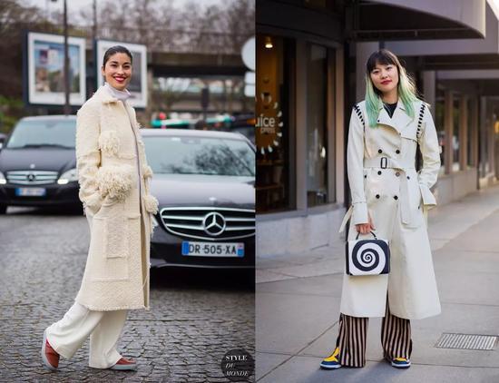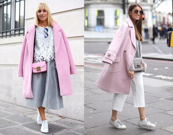拥有一件粉色大衣却不知道搭什么鞋子?赶紧拿出你的小白鞋,打造粉嫩系,超级减龄~