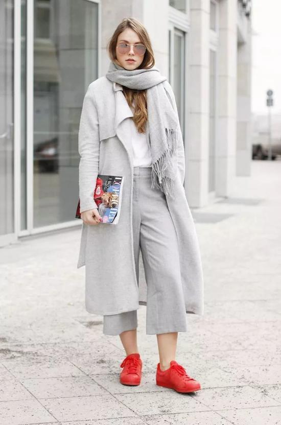 灰色这么百搭的颜色也是和白色在一起才能有这种高冷的感觉,所以啊,灰色大衣+小白鞋是可以完整copy的,喜欢这种性冷淡风格的小可爱们可一定不要错过啊!
