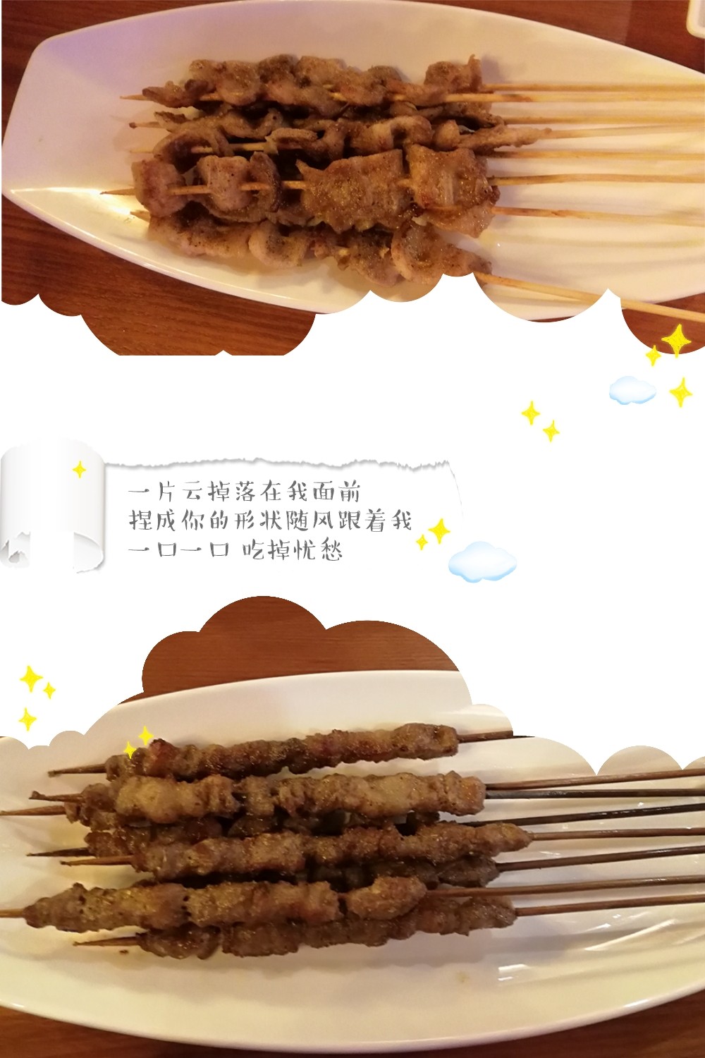 2 I5 ] w' Q. \8 l( d& T) |# e 再来一串烤五花和烤羊肉,肥儿不腻。